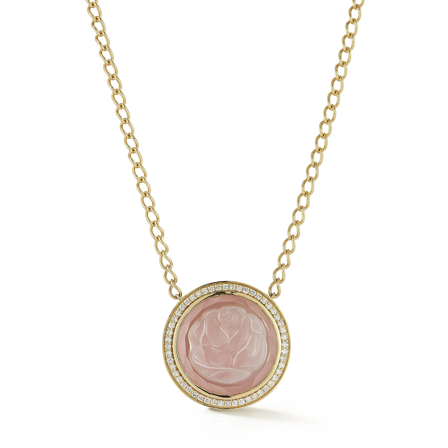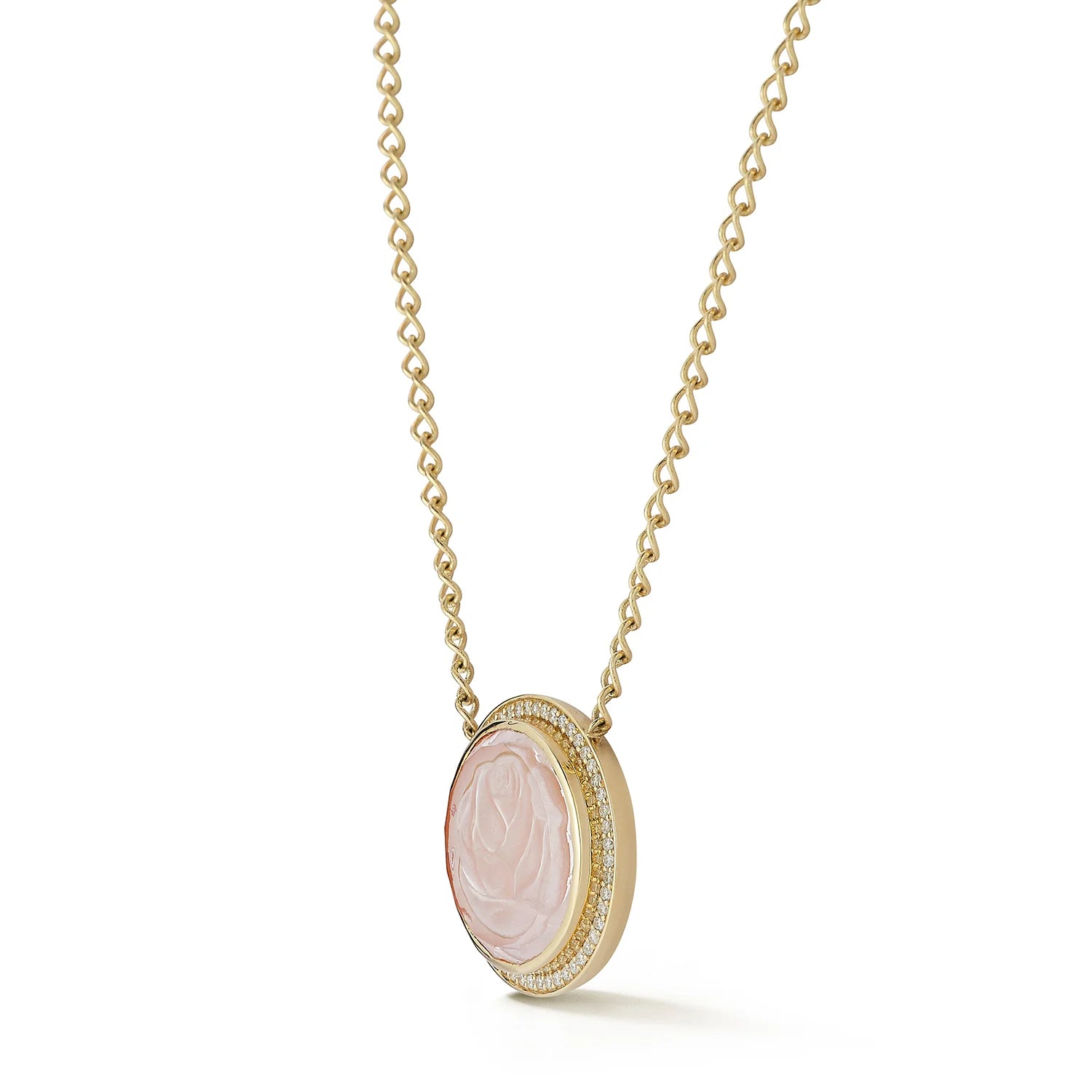 A rose in full bloom is hand carved on the reverse of this faceted rock crystal, backed with pink opal and bordered by diamonds.