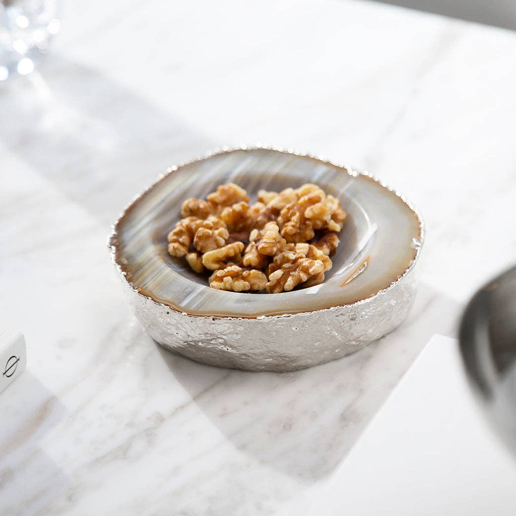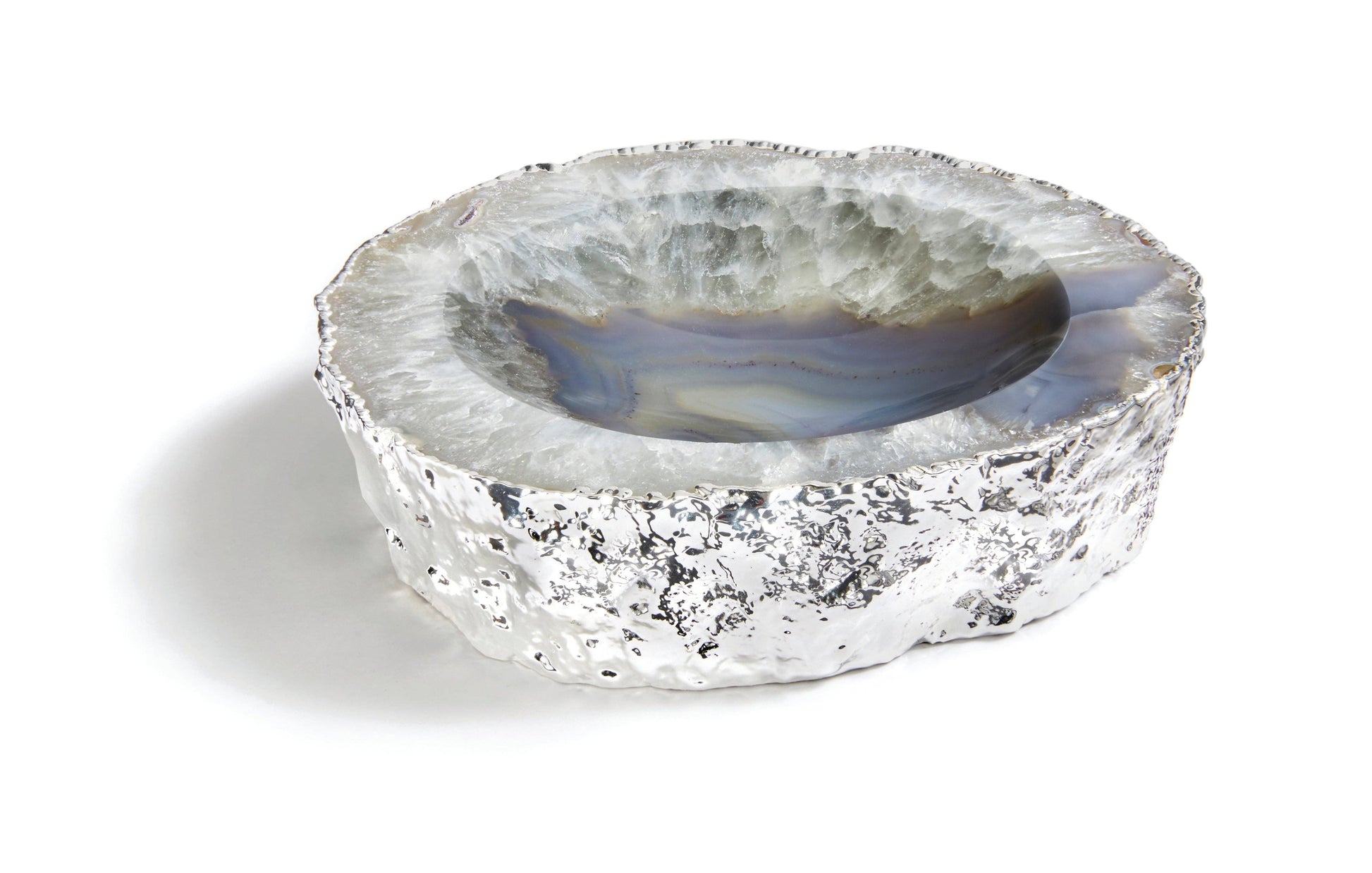 The Cascita Gemstone Bowl is designed to hold your personal treasures -- a place to put talismans or rings, just before going to sleep. We carve these one-of-a-kind pieces from premium semi-precious Agate and Crystal gems, thought to bring calmness to your home, and dress them up with pure silver. Our Agate bowl is made from a gem thought to encourage calmness and pleasant dreams.