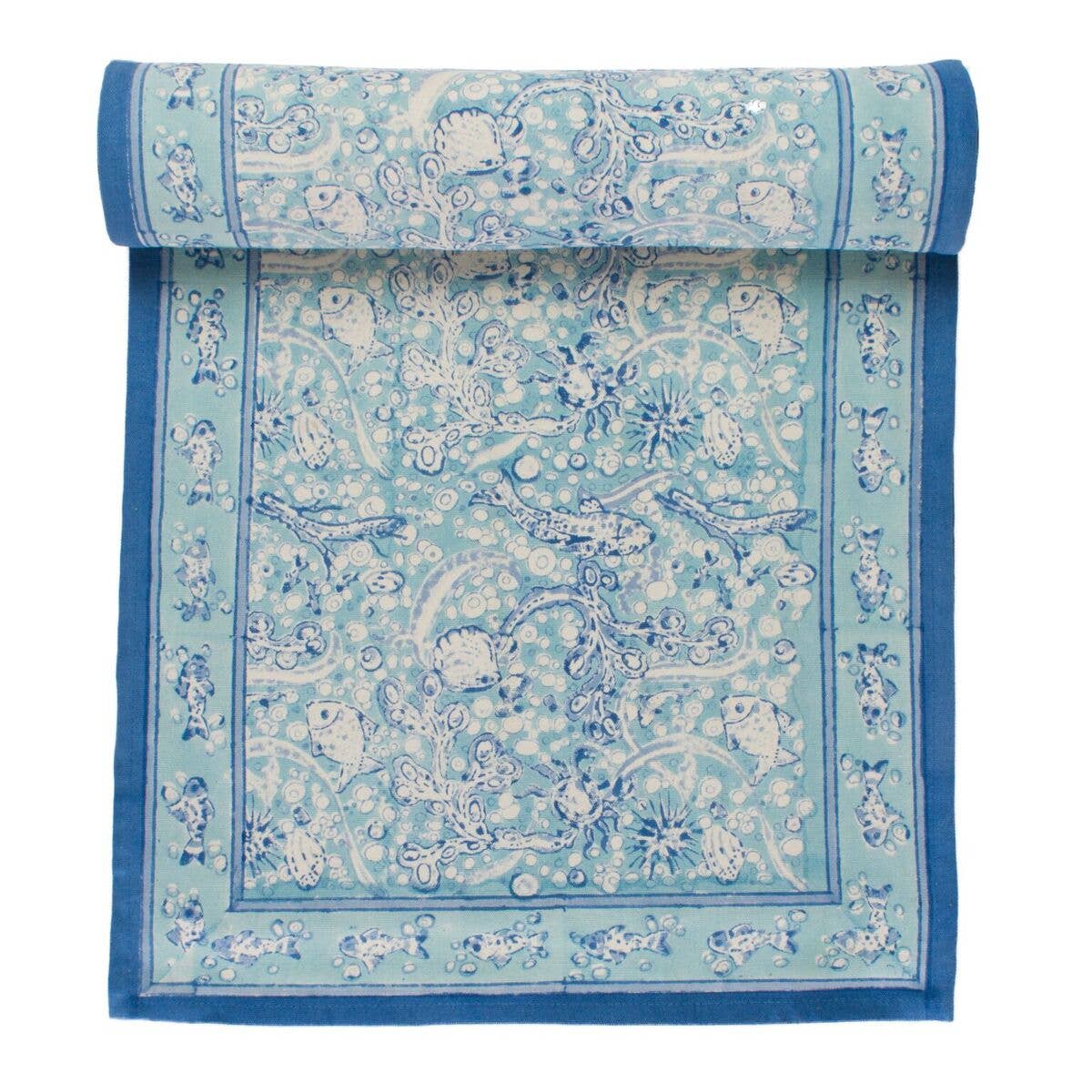 Brighten your dining area with the soothing seascape color palette and fanciful creatures of the La Mer Aqua collection. This piece offers a serene table setting for any summer celebration, evoking the feel of cool ocean breezes and sunlight sparkling upon the water. Reflecting the beauty of coastal destinations like the Côte d’Azur, this French linen.