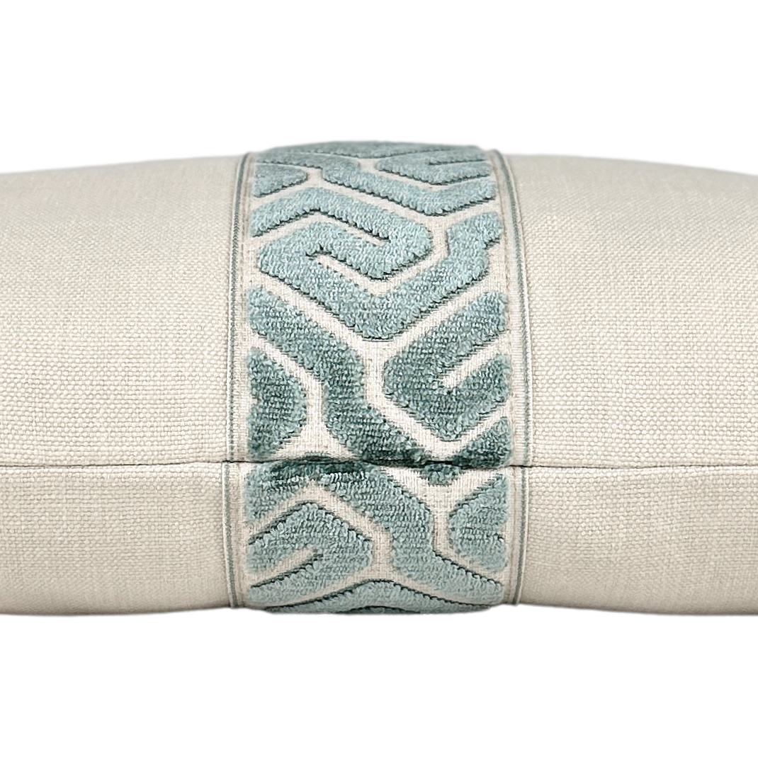 Enhance the look of any room with this sophisticated and stylish pillow. The beautiful solid sand cotton with lemongrass velvet trim down the center makes for a perfect accent on any sofa or chair.