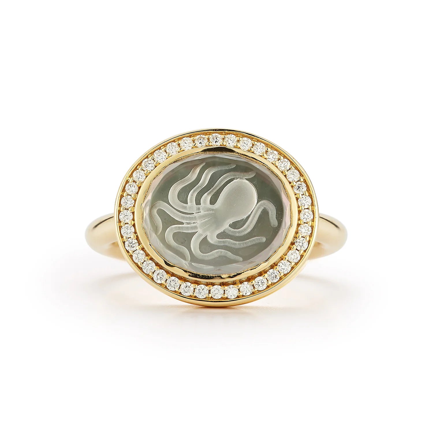 A playful octopus is etched in rock crystal and backed by mother-of-pearl to give the illusion of it gliding under the sea.