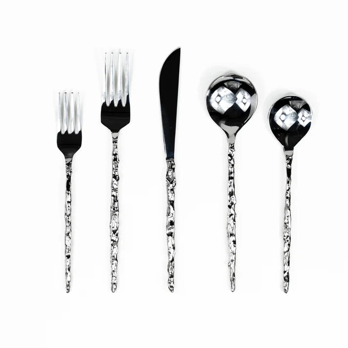 5 piece set includes dinner fork, salad fork, soup spoon, teaspoon, & dinner knife.