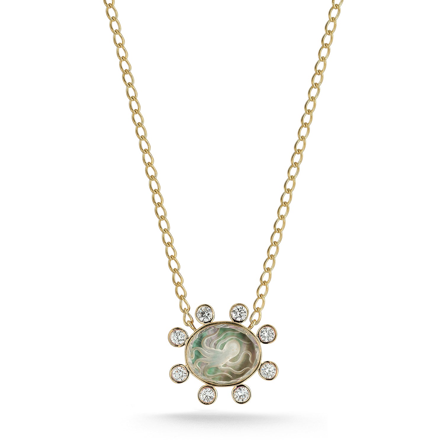 A playful octopus is etched in rock crystal and backed by mother-of-pearl to give the illusion of it gliding under the sea.
