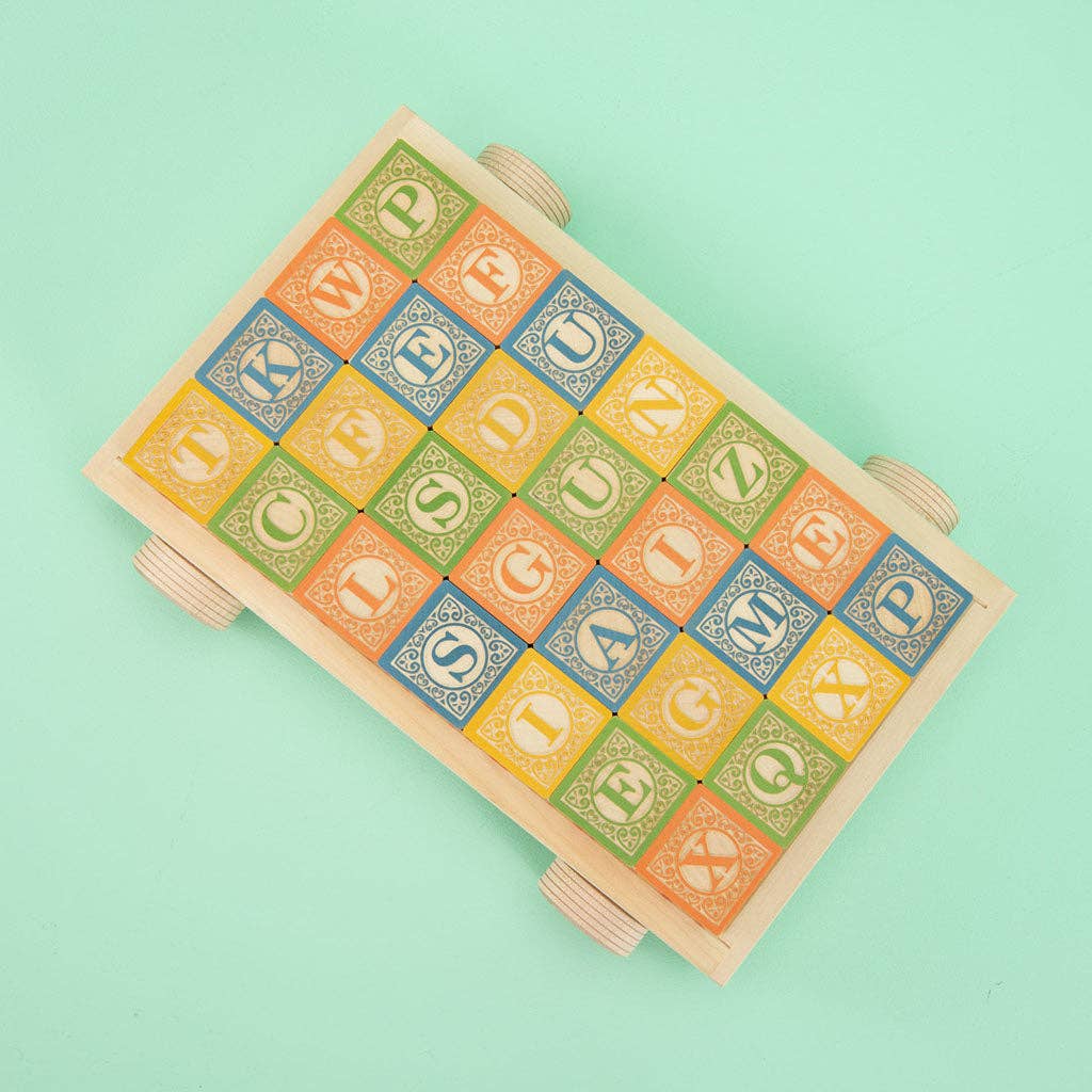 At last, you can own a 100% American-made vehicle. This Michigan basswood wagon provides sturdy storage and transportation for 28 ABC blocks. The Wheel treads? They're lathed in Maine. We engraved a handsome Uncle Goose logo on the bumper. Tote, sort, and store your blocks in this clever little wagon.