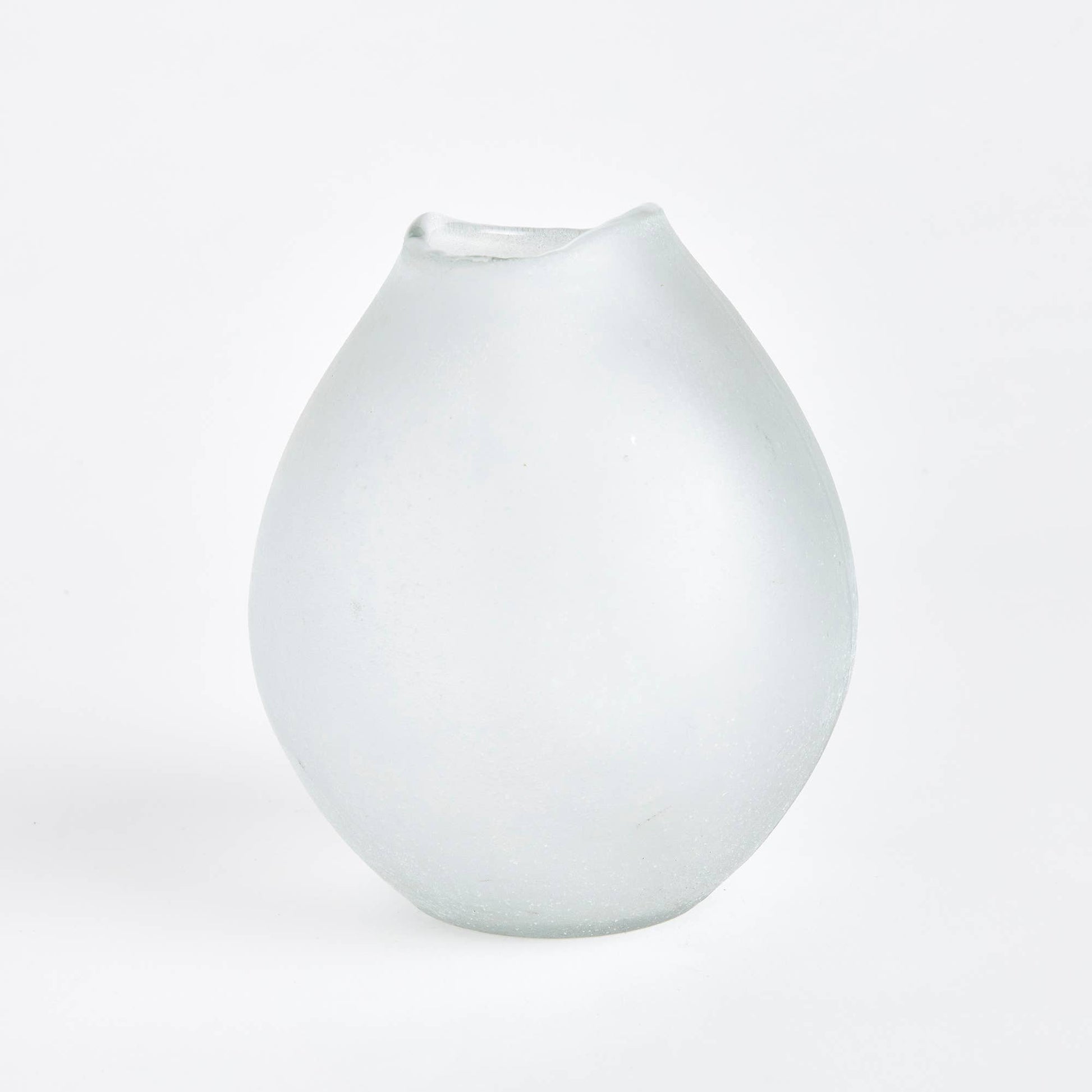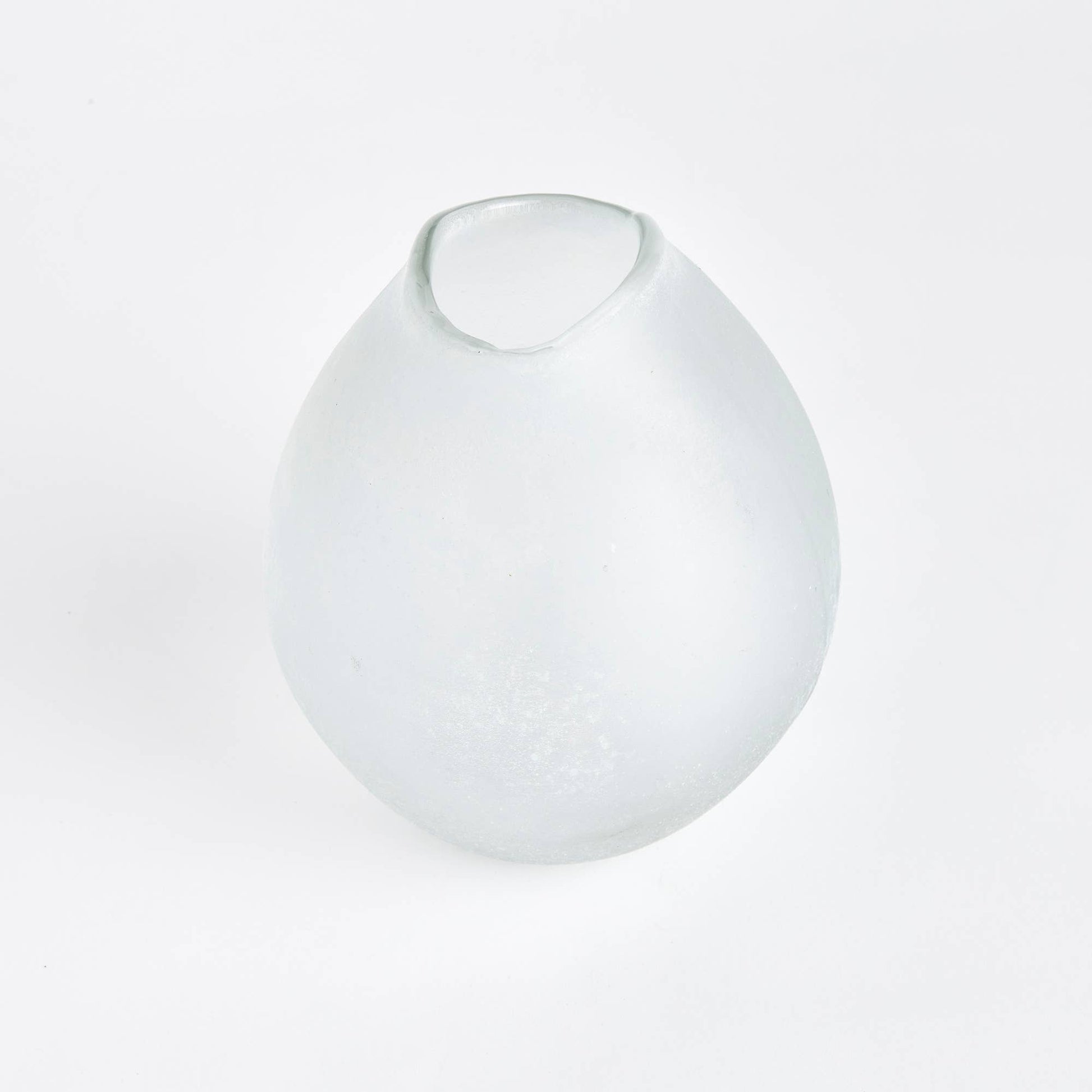 Nature-inspired, this hand blown glass vase has a bulbous shape and melted edge rim detail. The frosted glass only adds to it's appeal. A beautiful addition to bookshelf, mantel or side table. Color: White Frost . Interior use. Handwash glass. Avoid detergents or chemicals that might be harmful to finish. Like you, we believe in the beauty of home.